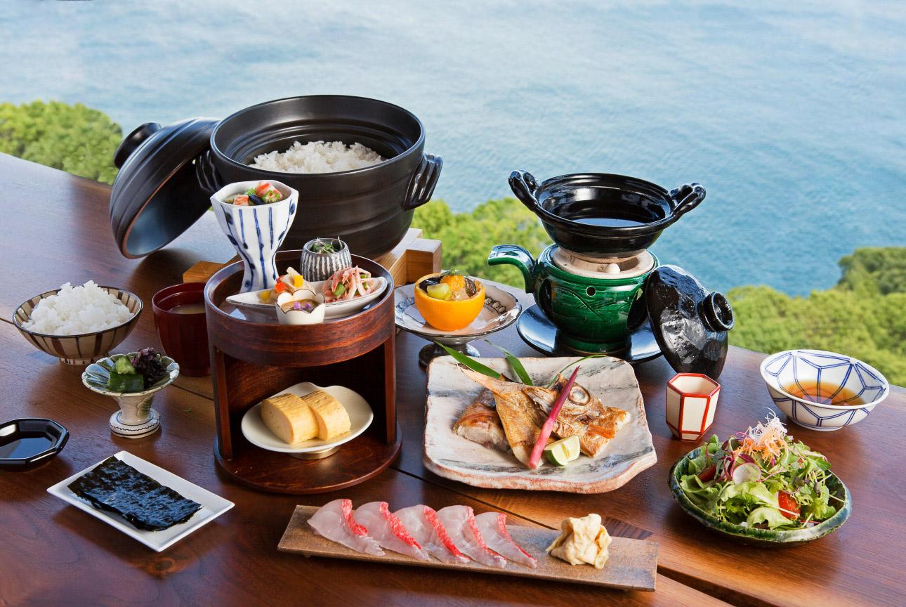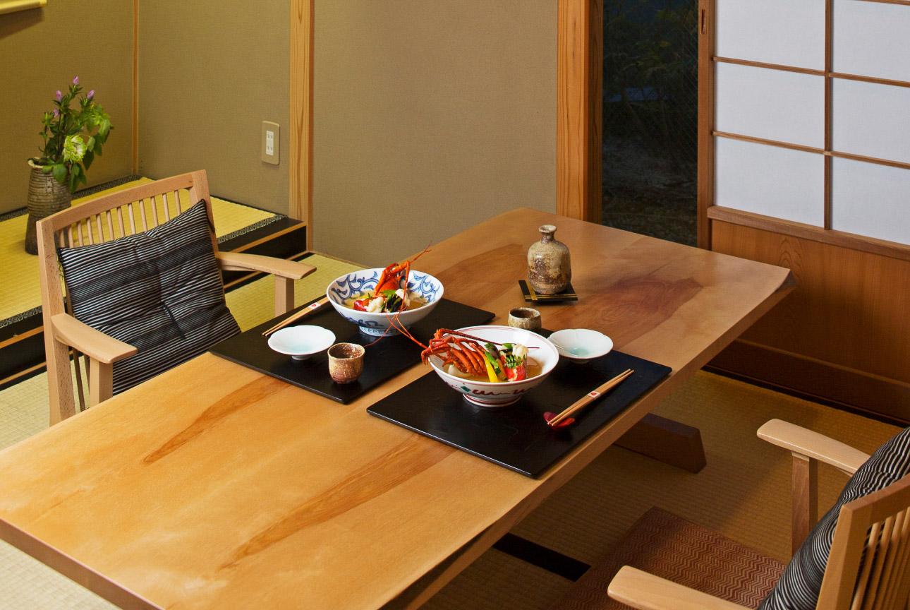 海に面した大きな窓から、相模湾を一望できる4Fのフロアです。 ジョージナカシマの家具など、備品に至るまですべてにおいてハイセンスな美しい空間です。室内に設けた専用のお食事処やゆりかごのように揺れるチンパンジーベッドなど、贅沢に過ごせる佇まいとなっています。 お食事は、お部屋お隣にしつらえた専用のお食事処【利休】にてお楽しみいただけます。テーブル、椅子席でご案内いたします。